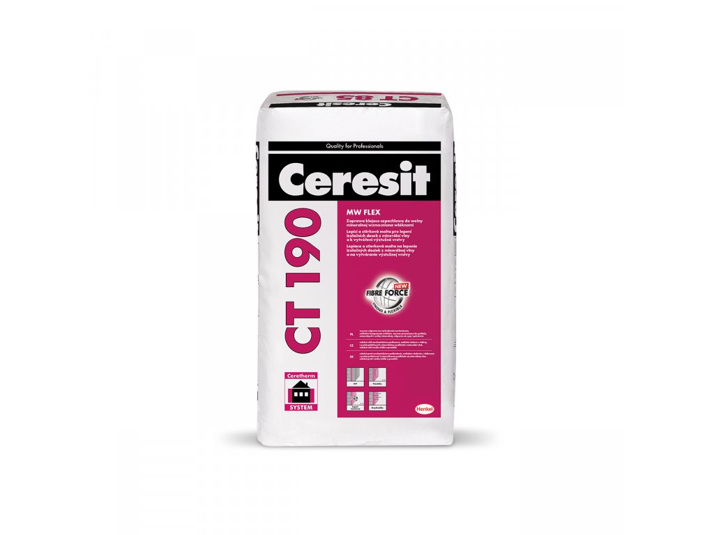 Malta Ceresit CT 190 je určena na lepení desek nebo lamel z minerální vlny a k aplikaci vrstvy vyztužené síťovinou ze sklených vláken v kontaktních systémech zateplení Ceresit Ceretherm (ETICS). Je určena pro lepení izolantu na svislé i vodorovné plochy, podhledy nebo stropy sklepních prostor. Je vhodná pro zateplení novostaveb i pro rekonstrukci stávajících fasád. Ceresit CT 190 díky použité speciálně vybrané kombinaci vláken posiluje odolnost zateplovacího systému vůči poškození, trhlinám a škrábancům.